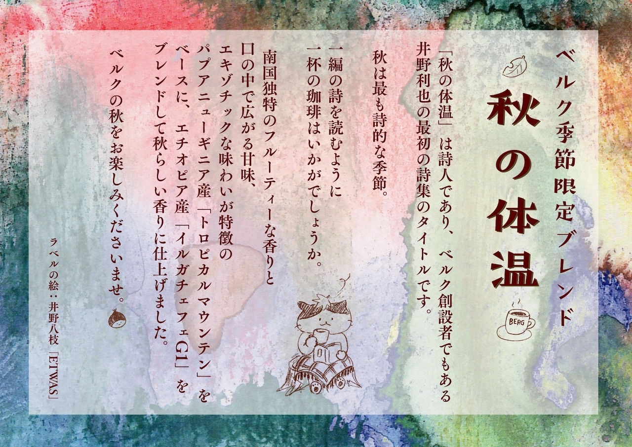今年の秋限定のベルクブレンドのタイトルは「秋の体温」。半世紀前にベルクをオープンした井野利也。詩人•北野恭として出したファースト詩集『秋の体温』をイメージしてブレンドしました。ラベル表の絵は井野八枝。裏には北野恭の詩の一編を。秋の体温の世界をゆっくりお楽しみください。
